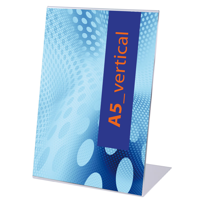 menu stojanček na výšku, formát A5, typ L, balené po 5 kusoch - plexi stojančeky vyrobené z priehľadného akrylu hrúbky 1,5 - 2,5 mm - formáty A4, A5 a A6 na výšku a na šírku - predaj po balení Typ: L Formát: A5 Prevedenie: na výšku Balenie (ks): 5