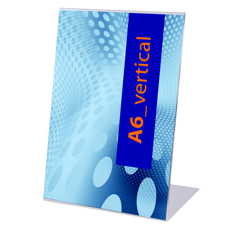 menu stojanček na výšku, formát A6, typ L, balené po 5 kusoch - plexi stojančeky vyrobené z priehľadného akrylu hrúbky 1,5 - 2,5 mm - formáty A4, A5 a A6 na výšku a na šírku - predaj po balení Typ: L Formát: A6 Prevedenie: na výšku Balenie (ks): 5