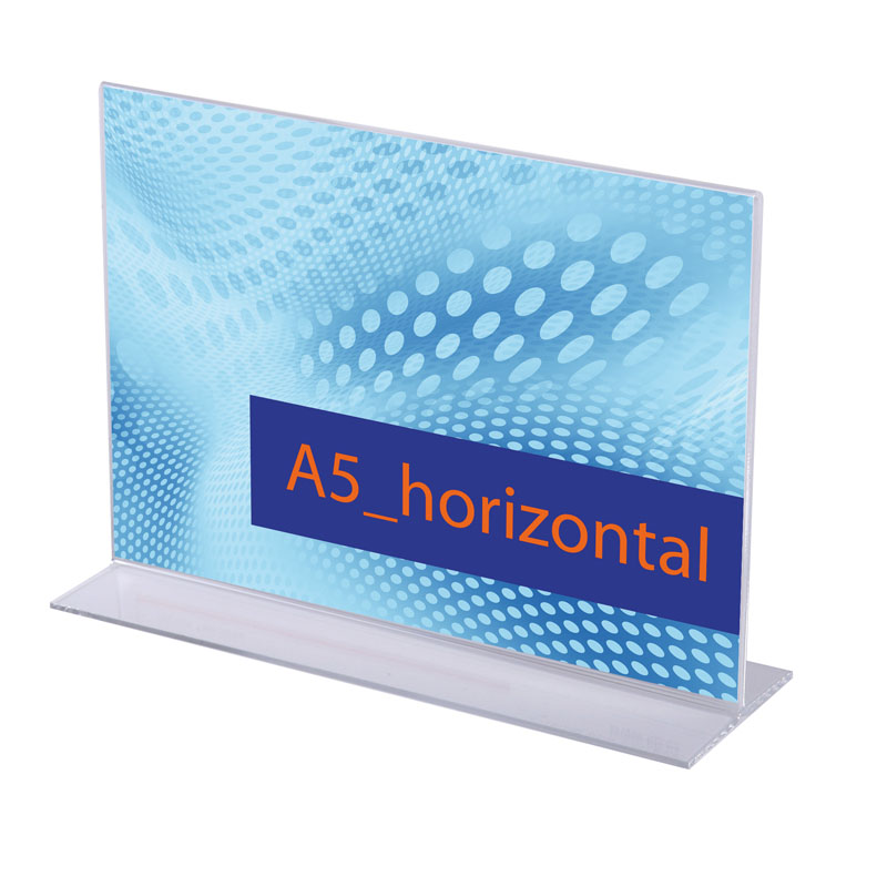 menu stojanček na šírku, formát A5, typ T, balené po 5 kusoch - plexi stojančeky vyrobené z priehľadného akrylu hrúbky 1,5 - 2,5 mm - formáty A4, A5 a A6 na výšku a na šírku - predaj po balení Typ: T Formát: A5 Prevedenie: na šírku Balenie (ks): 5
