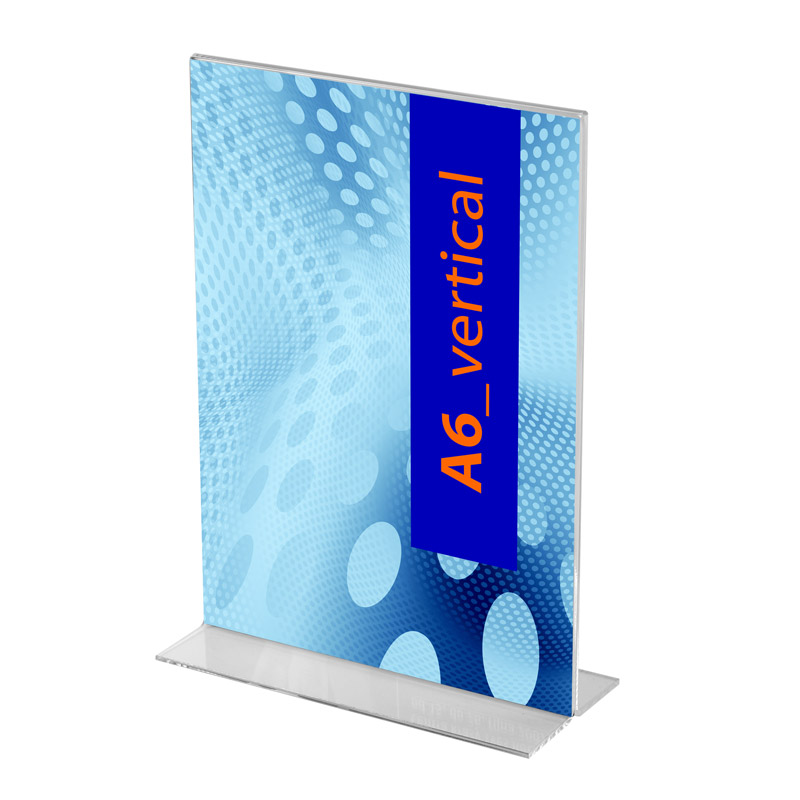 menu stojanček na výšku, formát A6, typ T, balené po 5 kusoch - plexi stojančeky vyrobené z priehľadného akrylu hrúbky 1,5 - 2,5 mm - formáty A4, A5 a A6 na výšku a na šírku - predaj po balení Typ: T Formát: A6 Prevedenie: na výšku Balenie (ks): 5
