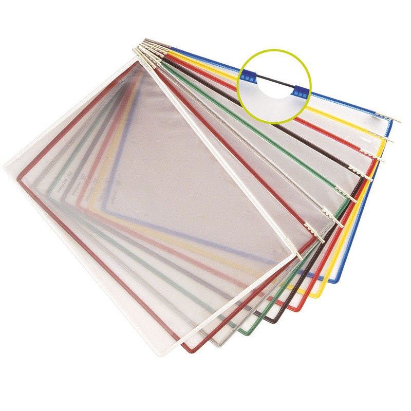 mix farieb samostatné tabuľky A4, balenie po 10 kusoch - závesné kapsy formátu A4 - s držiakmi pre nástenné alebo pultové stojany Technic - kapsy sú z PVC, ktorý neodráža svetlo a zasunutý dokument je dobre čitateľný - rám kapsy je vystužený oceľovým drôt