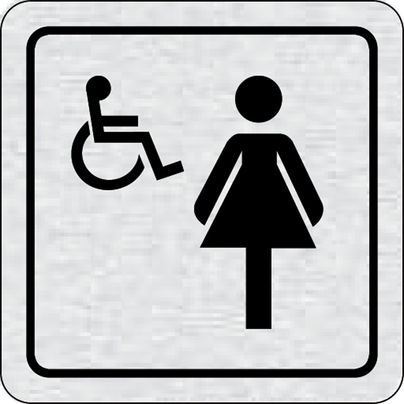 piktogram WC ženy invalidi, rozmer 80x80 mm - piktogram je vyrobený technológiou tepelne chemickej tlače na hliníkovú tabuľku- vďaka špeciálnemu chemickému zloženiu je výsledná tlač odolná proti poškrabaniu- piktogram s rozmerom 80x80 mm je zozadu vybaven