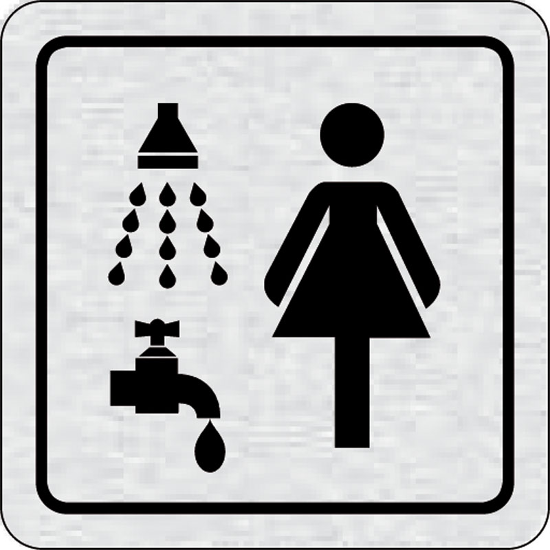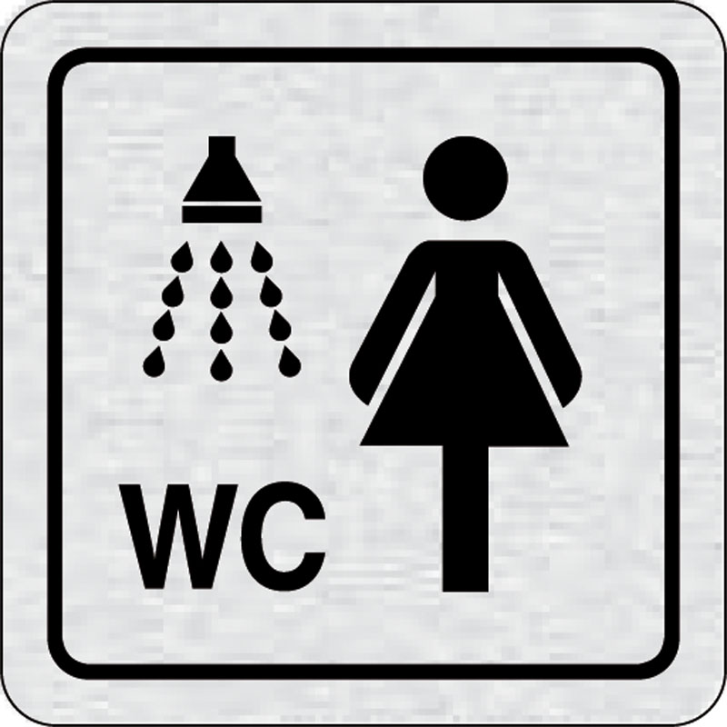piktogram sprchy, WC ženy, rozmer 80x80 mm - piktogram je vyrobený technológiou tepelne chemickej tlače na hliníkovú tabuľku- vďaka špeciálnemu chemickému zloženiu je výsledná tlač odolná proti poškrabaniu- piktogram s rozmerom 80x80 mm je zozadu vybavený