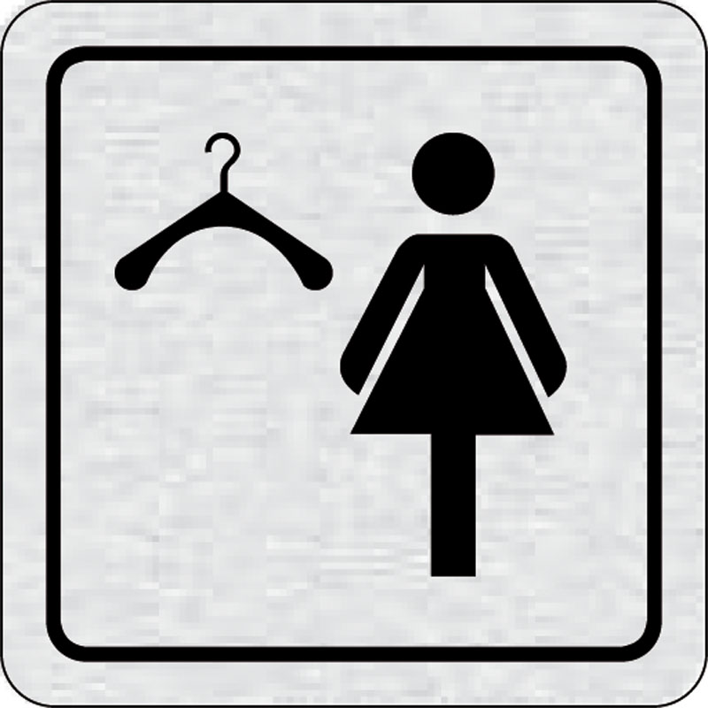 piktogram šatňa ženy, rozmer 80x80 mm - piktogram je vyrobený technológiou tepelne chemickej tlače na hliníkovú tabuľku- vďaka špeciálnemu chemickému zloženiu je výsledná tlač odolná proti poškrabaniu- piktogram s rozmerom 80x80 mm je zozadu vybavený samo