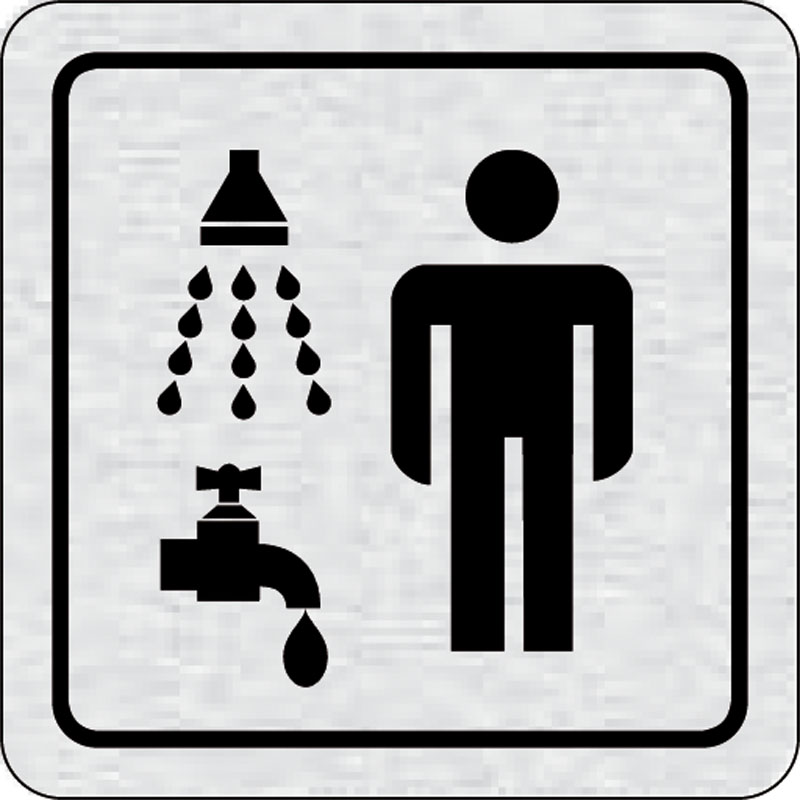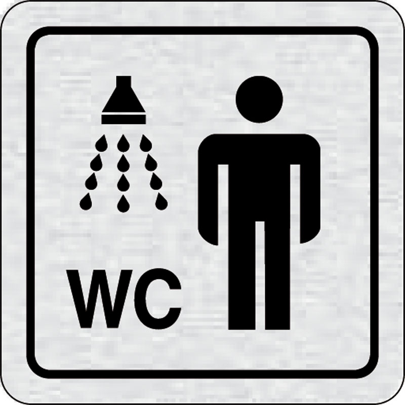 piktogram sprchy, WC muži, rozmer 80x80 mm - piktogram je vyrobený technológiou tepelne chemickej tlače na hliníkovú tabuľku- vďaka špeciálnemu chemickému zloženiu je výsledná tlač odolná proti poškrabaniu- piktogram s rozmerom 80x80 mm je zozadu vybavený