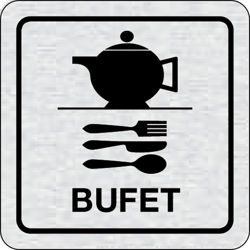 piktogram bufet, rozmer 80x80 mm - piktogram je vyrobený technológiou tepelne chemickej tlače na hliníkovú tabuľku- vďaka špeciálnemu chemickému zloženiu je výsledná tlač odolná proti poškrabaniu- piktogram s rozmerom 80x80 mm je zozadu vybavený samolepia