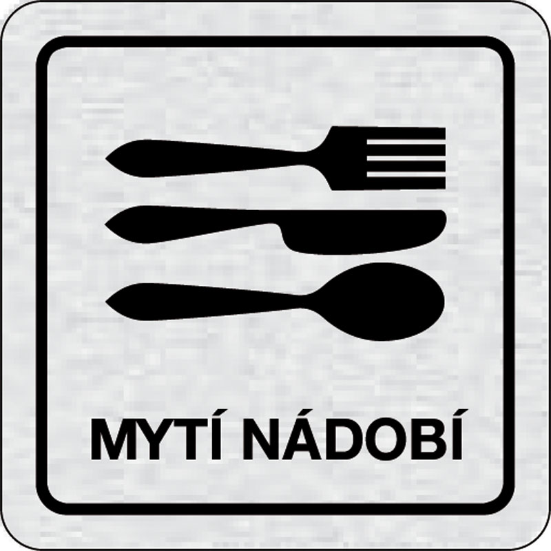 piktogram umývanie riadu, rozmer 80x80 mm - piktogram je vyrobený technológiou tepelne chemickej tlače na hliníkovú tabuľku- vďaka špeciálnemu chemickému zloženiu je výsledná tlač odolná proti poškrabaniu- piktogram s rozmerom 80x80 mm je zozadu vybavený