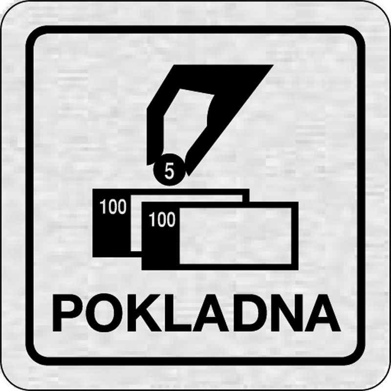 piktogram pokladňa, rozmer 80x80 mm - piktogram je vyrobený technológiou tepelne chemickej tlače na hliníkovú tabuľku- vďaka špeciálnemu chemickému zloženiu je výsledná tlač odolná proti poškrabaniu- piktogram s rozmerom 80x80 mm je zozadu vybavený samole