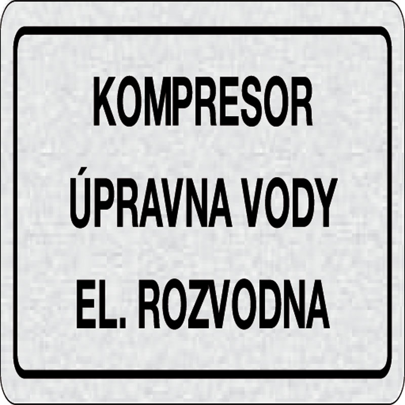 piktogram kompresor, úpravda vody, el.rozvodna, rozmer 160x80 mm - piktogram je vyrobený technológiou tepelne chemickej tlače na hliníkovú tabuľku - vďaka špeciálnemu chemickému zloženiu je výsledná tlač odolná proti poškrabaniu - piktogram s rozmerom 160