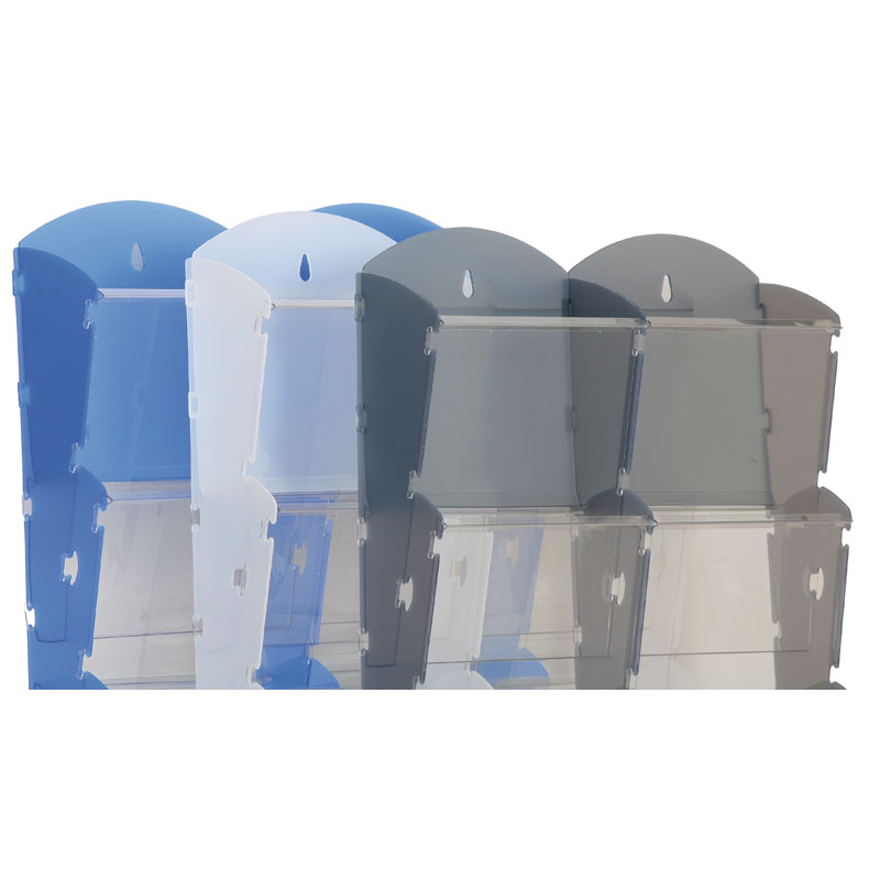 modrý zásobník na prospekty s kapacitou 2x5 A4 - zásobník na tlačoviny formátu A4 alebo A5- stĺpce po 5-tich kapsách hĺbky 25 mm- bočné steny zásobníkov vo farbách modrá, sivá a biela Farba: modrá Kapacita: 2x5 A4 Rozmery v x š x h (mm): 900 x 457 x 85