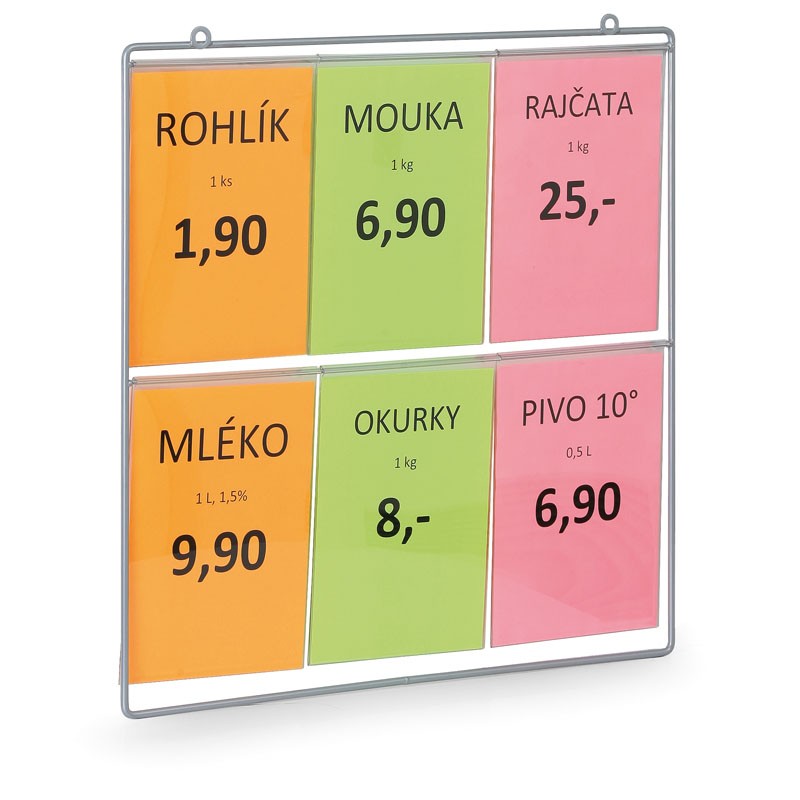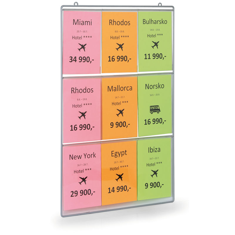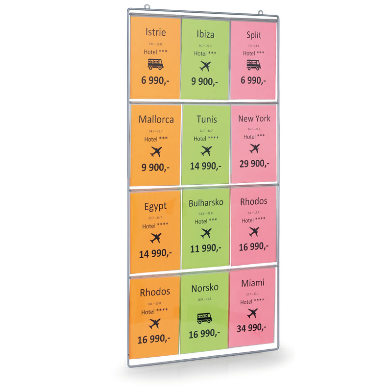 - kovový rám s priehľadnými plastovými kapsami na letáky- vhodné pre obchody, cestovné kancelárie, autosalóny- určené na umiestnenie do výkladov- letáky sa ľahko zasúvajú do káps z číreho plastu v tvare V- rám je opatrený kovovými očkami na zavesenie na prísavky, alebo lanká (prísavky sú súčasťou dodávky) - farba rámu strieborno-sivá