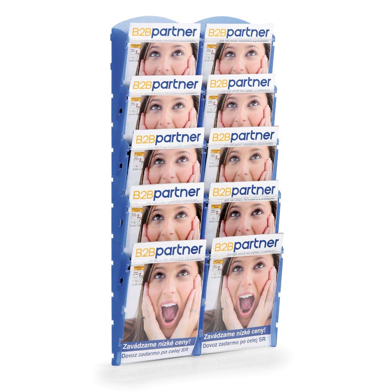 modrý zásobník na prospekty s kapacitou 2x5 A4 - zásobník na tlačoviny formátu A4 alebo A5- stĺpce po 5-tich kapsách hĺbky 25 mm- bočné steny zásobníkov vo farbách modrá, sivá a biela Farba: modrá Kapacita: 2x5 A4 Rozmery v x š x h (mm): 900 x 457 x 85