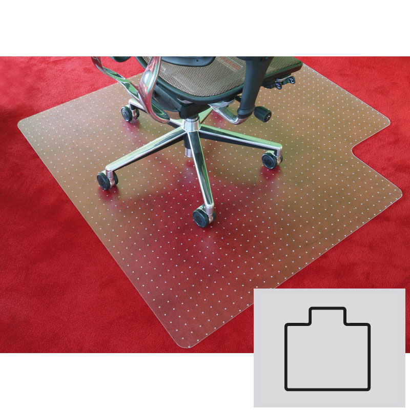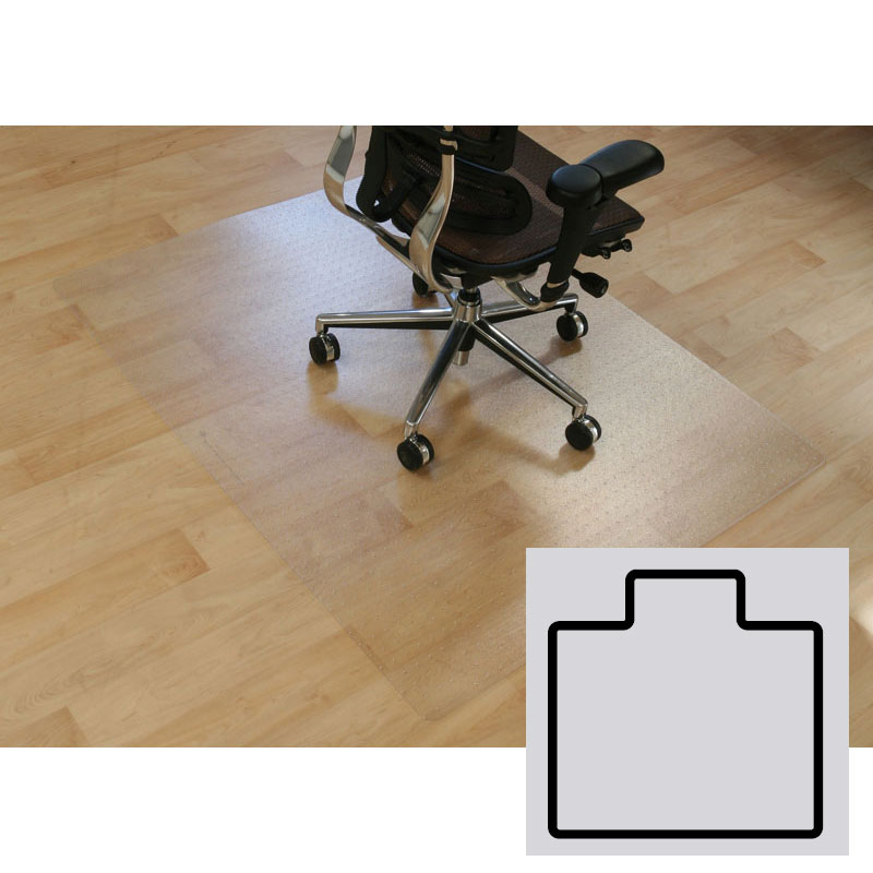 polykarbonátová podložka s výrezom na hladké podlahy, rozmery 1300x1200 mm - podložky sú vyrobené z transparentného materiálu - priemerná tvrdosť materiálu zaisťuje dokonalé priľnutie k podlahe - podložky sú vhodné na všetky druhy tvrdých podláh ako dreve