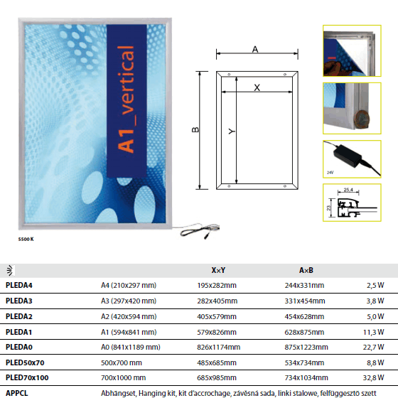 Ultratenký design LED rámu A1 so zaklapávacím systémom pre ľahšiu výmenu plagátu. Vďaka LED diodám v hrane panelu, šetrí až 70% energie oproti štandardným rámom. Dlhá životnosť svetelného zdroja.