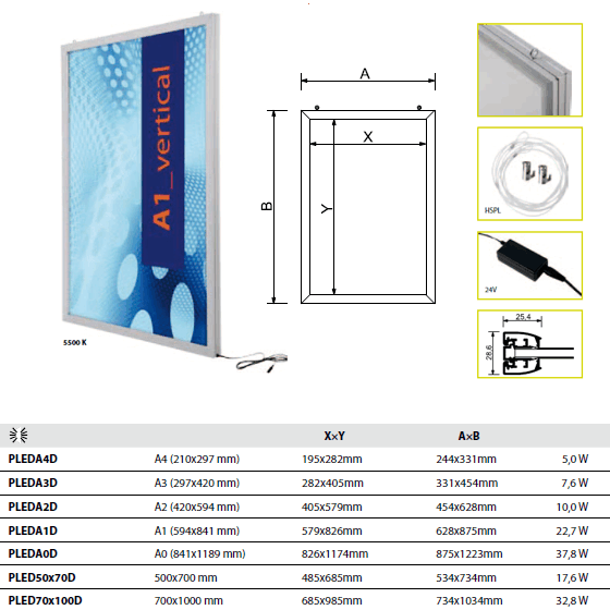 Obojstranný plagátový rám formátu 50 x 70 cm, presvetlený LED diodami prostredníctvom najnovšej DSE technológie. Je určený pre obojstrannú prezentáciu plagátov. Mechanické oddelenie zaručuje vzájomnú