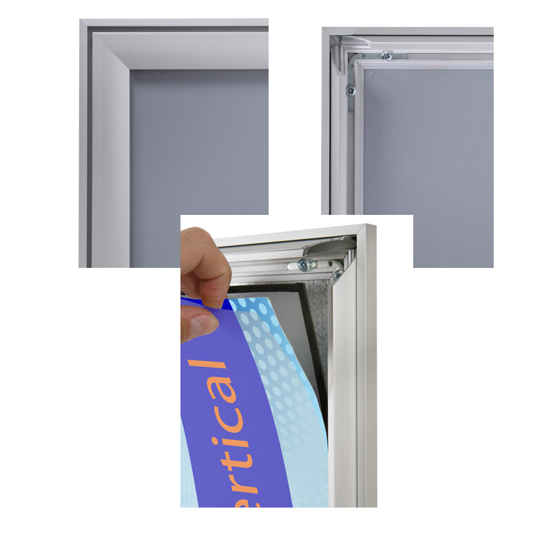 plagátový rám s ostrými rohmi, formát A1- hliníkový rám široký 25 mm- zaklapovací systém umožňuje rýchlu a jednoduchú výmenu plagátu- antireflexná krycia fólia na ochranu plagátu- možno umiestniť ako na výšku, tak aj na šírku- montážny materiál súčasťou